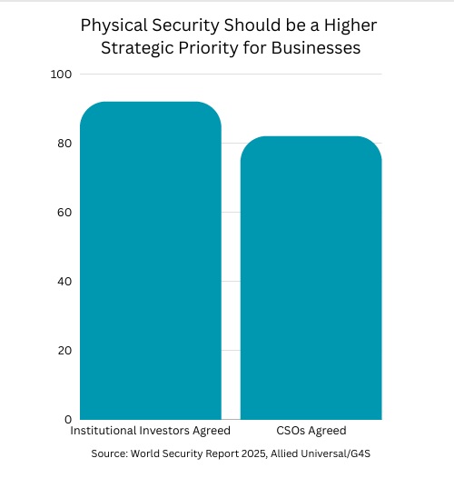 “In an increasingly volatile and polarized world, physical security has become a critical strategic imperative, a corporate value driver, and a barometer of a company’s financial health and market perception,” according to the study. “This is powerfully demonstrated in the views of both chief security officers (CSOs) and global institutional investors [and] indicates that institutional investors are even more concerned about physical security than those at the forefront managing it day to day.”
